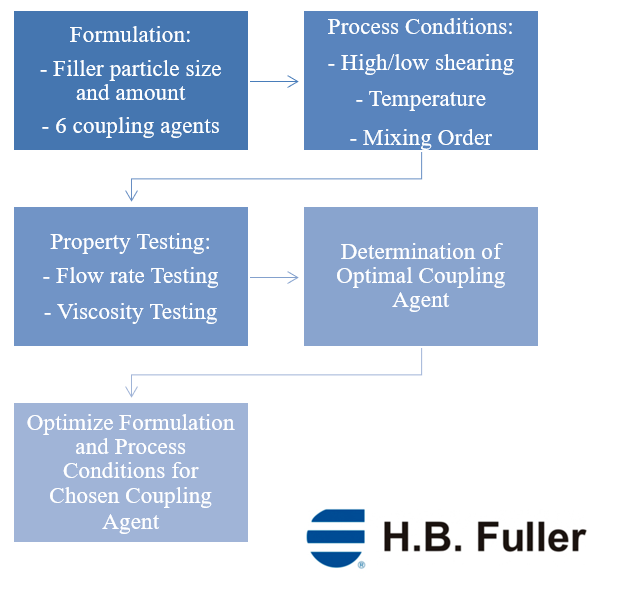 During my internship with H.B. Fuller, I worked on developing 2K thermal management materials for electronics applications. These materials are designed to improve heat transfer across rough interfaces by combining a pliable polymer matrix with conductive metal oxide fillers. A major challenge, however, was that maximizing thermal conductivity required very high filler loading, which hurts processability. My role was to evaluate eight different coupling agents by formulating and manufacturing several batches of thermal management materials, varying factors such as coupling agent concentration, binder content, temperature, and mixing speed. I then used flow rate and rheology testing to compare processability and identify the strongest coupling agent candidate, which I further optimized.