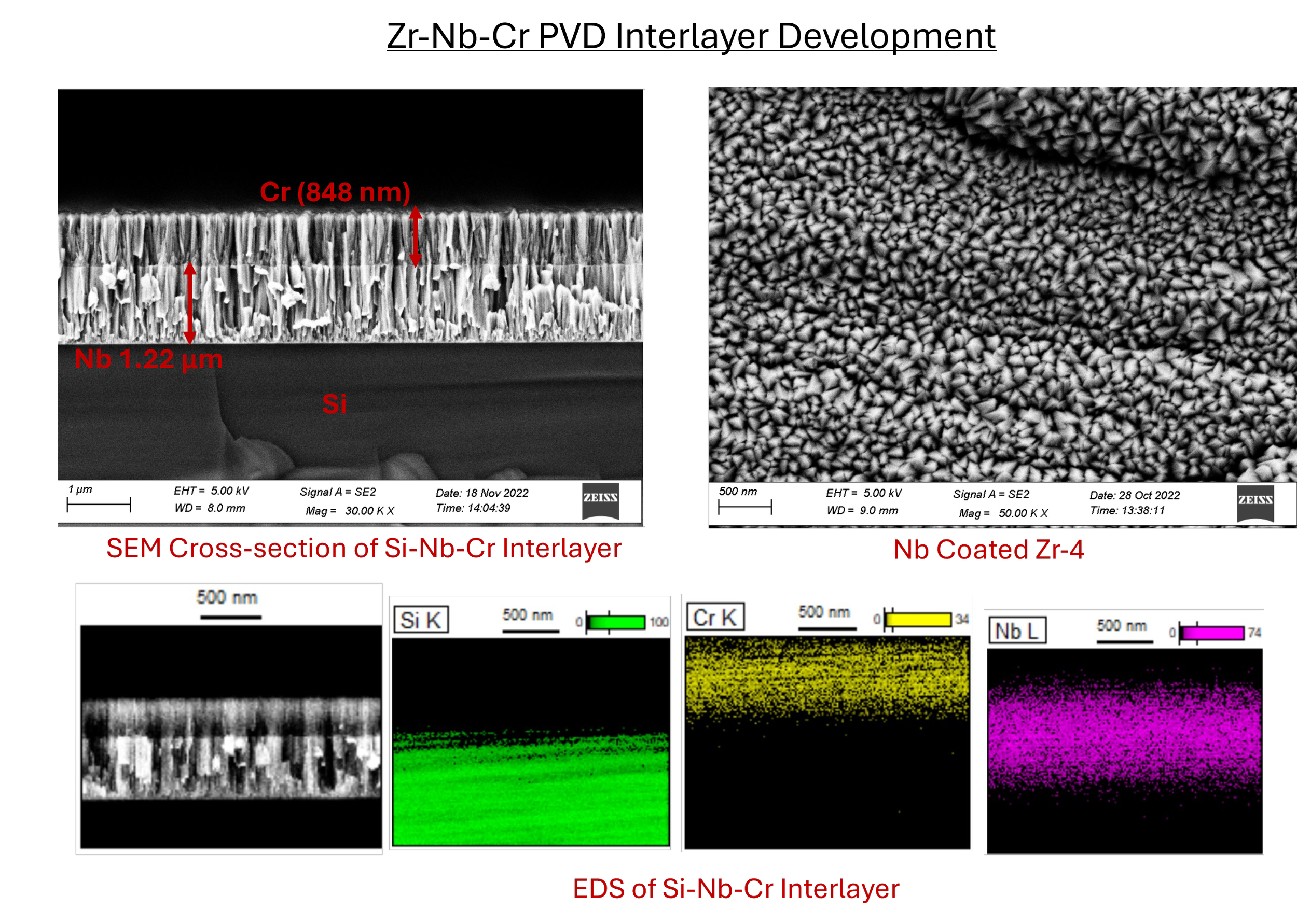 Following the disaster at the Fukushima-Daiichi nuclear power plant in 2011, researchers have looked to develop oxidation-resistant coatings on nuclear fuel rods to improve their performance under loss of coolant accident conditions. Chromium thin film coatings show promise due to chromium’s low oxidation rate. However, chromium reacts with the zirconium fuel rod to form a low melting temperature eutectic. Therefore, my work looked to develop an intermetallic diffusion barrier using physical vapor deposition (PVD). In this project, I ran the in-house PVD development and was responsible for preparing samples, depositing the thin film dual-layer coatings with a variety of barrier materials, and then measuring the microstructural and mechanical performance of these coatings using high-temperature testing, SEM/EDS, XRD, and nanoindentation.